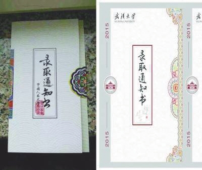 近日,因为武汉大学今年的录取通知书和中国人民大学去年的通知书很相似,武大和人大学生在网上展开了激烈争论。人大校友笑称,“欢迎收到通知书的同学来人大,毕竟很容易一激动就看走眼了”。武汉大学则回应称,两个版本的通知书在形式上虽“撞脸”,但并不存在抄袭。人大是“海水江崖纹”,武大是“龙腾鱼跃纹”,再加上中国书法都差不多,所以看起来很相似。
