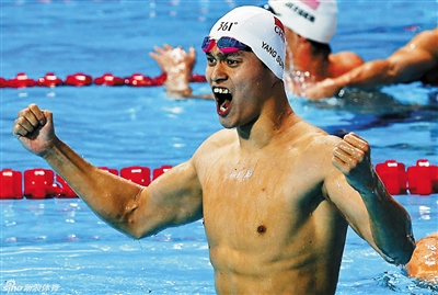 孙杨以预赛第一名的成绩进入决赛。和预赛时一样,孙杨的头号对手还是英国人盖伊。盖伊在前半程发挥不错,始终领先孙杨一点游在最前,而孙杨则从容应对,既不让盖伊拉出自己太多,也不给其他选手超出机会。100米结束时盖伊领先0.10秒,200米游完后领先0.04秒,300米时领先0.02秒。最后100米,孙杨出击!他一加速,立刻就超越盖伊。英国人当然想追,但当孙杨的速度出来后,盖伊无能为力。
