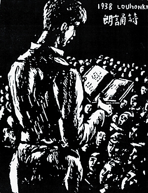 需要补充说明的是,“全木协”成立时选出了以马达、力群、罗工柳等二十位木刻家组成的理事会,其中卢鸿基等五人又被推举为集体领导协会工作的常务理事,其办公地点和三厅美术科并作一处。罗工柳所说的画展即“全木协”主办的“全国抗战木刻展览会”(简称“木展”),当时展出的204幅木刻中包括了卢鸿基的“朗诵诗”、“母与子”、“朱德将军及其伙伴们”、“谁使你们流亡”、“儿呀!为了祖国,勇敢些,”等作品多幅。这些展品同时还在《五月》、《木刻选集》等书刊发表,后来又被陆续选送到法、英、美等国媒体,对宣传中国的抗战起到了积极作用。展览结束后,罗工柳携带一套“木展”展品去了延安。不久,“全木协”常务理事马达、力群等人也相继离开三厅,至此“全木协”的会务实际上就全部留给了原来分管展览的卢鸿基一人负责。