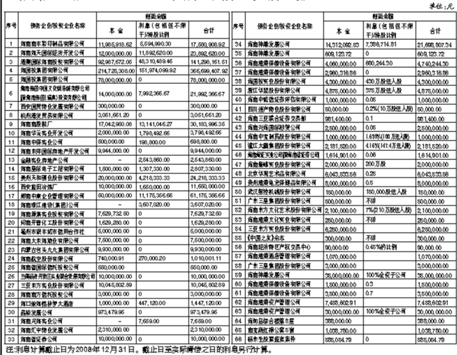 根据协议,海南联合资产管理公司已从相关金融机构受让了下列债权、股权投资权益、其他类资产及其相关权益(清单所列利息计算基准日为2008年12月31日。基准日至实际偿还之日止的应付利息按相关约定届时另行计算)。海南联合资产管理公司作为下列债权、股权投资权益、其他类资产及其相关权益的受让人,现公告要求债务人、担保人及其他义务人立即向海南联合资产管理公司履行相应合同约定或法院判决所确定的义务(若债务人、担保人及其它义务人因各种原因更名、改制、歇业、吊销营业执照或者丧失民事主体资格,请相关承债主体、清算主体代为履行义务或者承担清算责任)。联系电话:0898-68582219;联系地址:海南省海口市滨海大道81号南洋大厦23楼。 海南联合资产管理公司