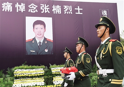 8月2日,在沧州市烈士陵园举行的张楠烈士骨灰安放仪式上,武警战士手捧骨灰盒从张楠烈士遗像前走过。 今年7月26日晚,我驻索马里使馆所在酒店遭遇恐怖分子汽车炸弹袭击,张楠不幸在袭击中颈动脉破裂,经抢救无效英勇牺牲。张楠系河北省沧州市吴桥县籍,牺牲时年仅28岁。张楠烈士的灵柩8月1日晚回到济南,武警部队追授他“中国武警忠诚卫士”奖章。 新华社发(傅新春 摄)