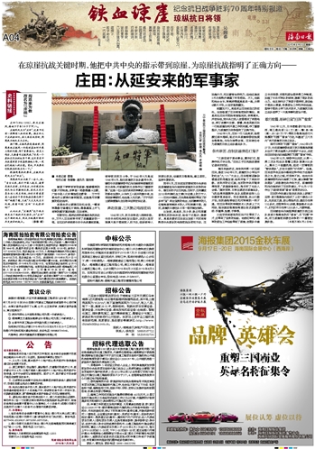 | 海南日报 纪念抗日战争胜利70周年特别报道 004 2015-08-031 2015年08月03日 星期一 |