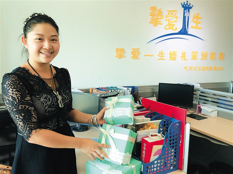 推开基地中一家婚礼策划机构的门,捧花、气球、礼盒、蕾丝……一股浪漫的气息扑面而来。机构只有5名主要成员,负责人韩馨莹与4名女孩在2014年初进驻了基地。可不要小看这个5人小公司,韩馨莹笑称这个团队已经在全省多地成功策划了几十场婚礼。“进驻初期,我们还只是小工作室,做简单的婚礼现场布置,但现在我们已经是专业的婚礼策划团队。”