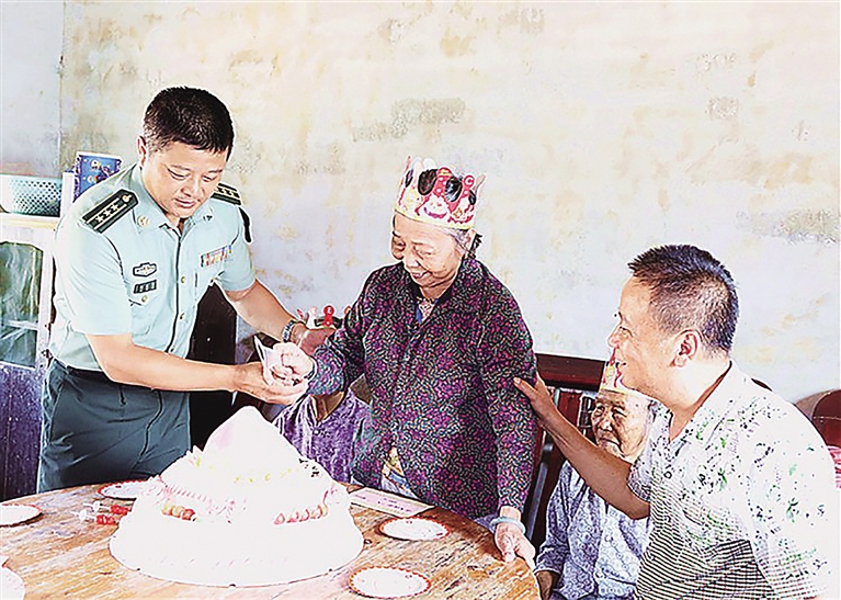 八一建军节,万宁市武装部人员来到北大镇联群村委会土田村,为88岁的琼崖纵队老兵徐辉荣庆祝“特殊生日”。徐辉荣年幼时父母被日本鬼子杀害,无家可归的她后来参加了琼崖革命。一直不知自己出生日期的徐辉荣,怀着对部队的深情厚谊,把自己的生日定在了“八一建军节”这一天。图为万宁市武装部部长何大为送来蛋糕给徐辉荣过生日,并为在座的郑爱莲等琼纵老战士送上节日的祝福。通讯员 邱名广 摄