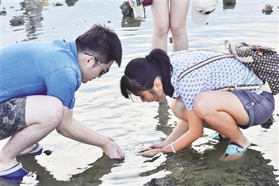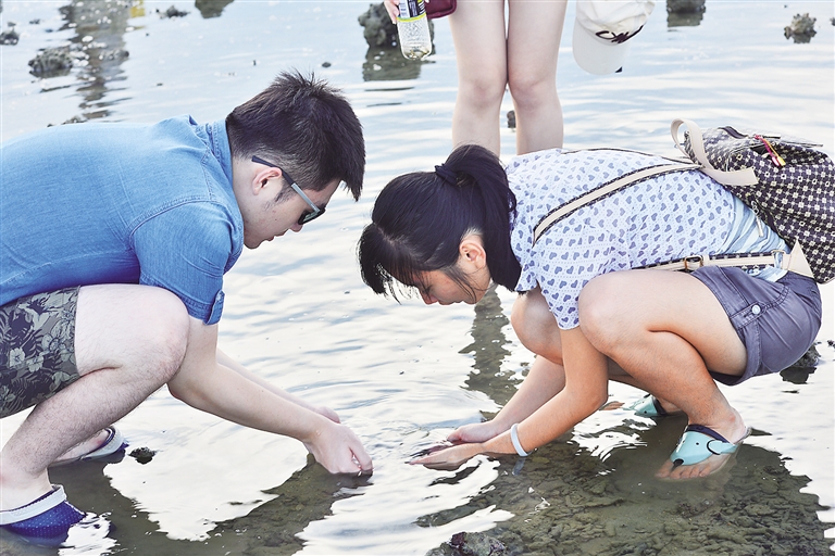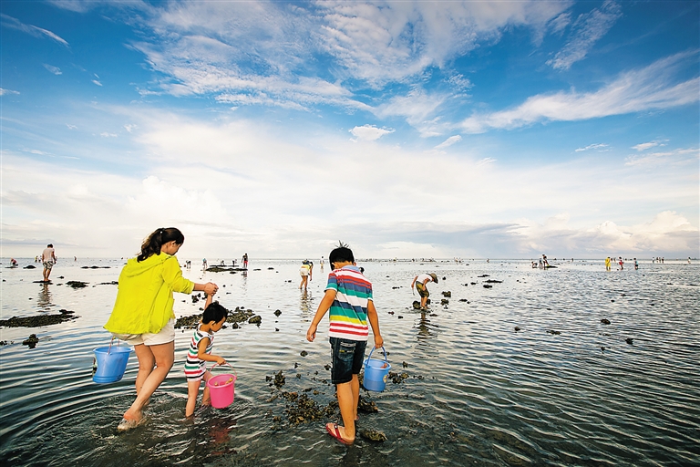 早上还碧波万顷的潭门湾,到了下午五点多海水退潮后,刚刚没过脚面的海面上到处都是前来赶海的游人。在这些游人当中,大多数是父母带着孩子一起来的,他们卷起裤腿,带上小铲子和水桶下到水里,在海边踏浪戏水寻找各种贝壳、海螺、螃蟹和鱼类等大海的馈赠。有的家长和孩子手牵手赶海拾趣,有的漫步在沙滩上,有的享受纯野生海鲜大餐,沐浴温和的海风,体验真实的渔民生活。美好的亲子时光定格在沙滩大海之间,成为潭门湾一道靓丽的风景线。