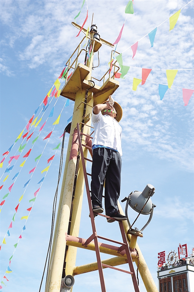 祭祀仪式上,一位渔民立于一艘500吨钢质渔船船头,单手插腰,另一手紧握大海螺号,面向远方吹出了悠扬的号声,岸上奏起民乐,舞龙舞狮队和鲤鱼队随乐起舞。这是潭门渔民自古以来就有的祭海民俗,每年中元节前后,渔民们都会拜祭龙王、海神娘娘,祭船,送渔灯,祈求保佑在新的一年平安,获得大丰收。祭海仪式结束后,再组织抢收鱼货、织网、夹海螺、串贝壳、海上救援等海上生产技能大赛,极具渔家特色和观赏性。