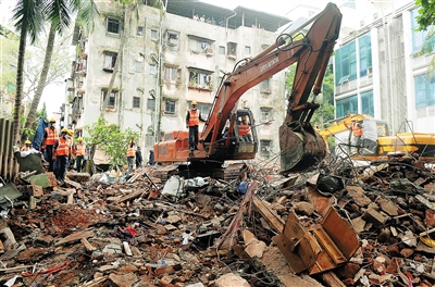 8月4日,在印度孟买市郊,救援人员在楼体坍塌事故现场开展搜救工作。 印度警方4日说,孟买市郊一处老旧建筑因持续多日强降雨而于当天凌晨发生楼体坍塌,造成至少12人丧生。 新华社/法新