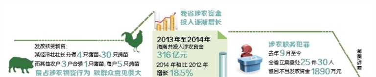 据我省有关部门统计,2013年至2014年,海南共投入涉农资金316亿元,2014年相比2012年增长18.5%。