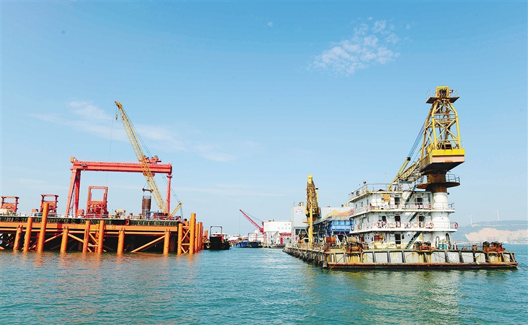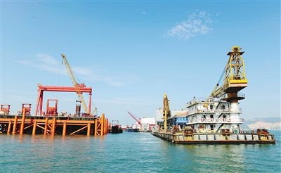 8月3日,中铁大桥局五公司的施工人员正在福建福平铁路平潭海峡公铁两用大桥最大航道桥N03主塔墩进行钻孔桩施工。目前,福平铁路重点控制性工程—平潭海峡公铁两用大桥的6个主塔全面开工建设。 我国首座跨海公铁两用大桥——平潭海峡公铁两用大桥是新建的福州至平潭铁路、长乐至平潭高速公路的关键性控制工程,从福州长乐岸跨越一个航道(即元洪航道)、三个水道及4个海上岛屿,与平潭岛相连。该桥于2013年11月动工建设,全长16.45公里,总投资约240亿元,预计2019年建成通车。 新华社发