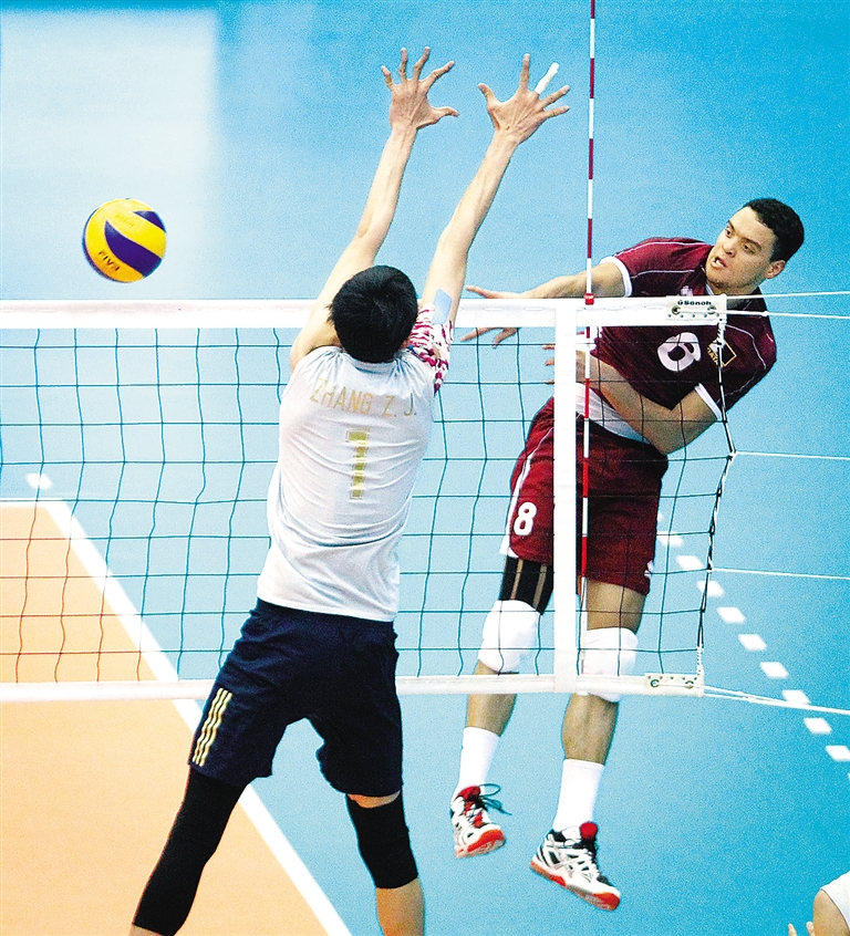 8月4日,在伊朗德黑兰举行的第18届亚洲男子排球锦标赛复赛中,中国队以3:2战胜卡塔尔队,成功晋级八强。图为卡塔尔队球员若昂· 内托在比赛中扣球。 新华社发