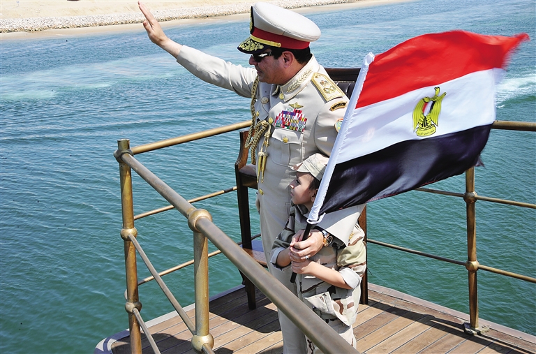 塞西签署了由苏伊士运河管理局递交的新苏伊士运河通航许可,标志着这一耗时一年的庞大工程正式竣工投入使用,塞西称新运河是“埃及人民经过不懈努力给予世界的赠礼”。在其演讲中停顿期间,两艘巨大船舶沿新老运河河道相向驶来,伴随着现场的欢呼声同时通过运河。