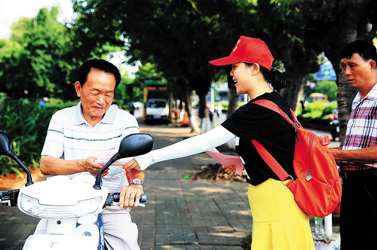 8月8日上午,省直机关工委组织机关1000名党员干部职工志愿者,参加“双创”工作文明交通劝导省市行动日活动。 图为海南日报报业集团的党员干部职工在海甸岛人民大道人民桥至三路路段宣传道路交通安全法。本报记者 张杰 摄