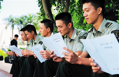 8月6日,驻海口市部队召开“驻海口市军警部队积极参与‘双创’协调任务部署会”,成立了工作协调领导小组,争当海口市“双创”主力军与排头兵。图为解放军战士在学习《海口市“双创”工作知识问答手册》。 本报记者 苏建强 通讯员 唐学斌 摄