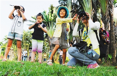 8月9日,30多名小朋友及其家长在志愿者带领下,来到海口万绿园,观赏生活在这里的130多种鸟类,对比图鉴学认识鸟类并了解它们的生活习性与生态指示意义。