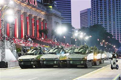 8月9日,在新加坡举行的成立50周年庆祝活动上,新加坡军队接受检阅。 新华社/法新