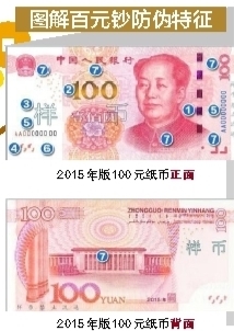 央行称,2015年版100元纸币,在保持规格、主图案、主色调等与2005年版100元纸币不变的前提下,采用了先进的公众防伪技术,使公众更易于识别真伪。