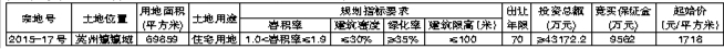 经陵水黎族自治县人民政府批准,陵水黎族自治县国土环境资源局决定以挂牌方式出让2015-17号宗地项目的国有建设用地土地使用权。现将有关事项公告如下:一、挂牌出让地块的基本情况和规划指标要求