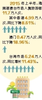 据统计,2015年上半年,海南港澳台市场入境旅游者11.7万人次,其中香港4.99万人次,澳门0.47万人次,台湾市场6.24万人次。