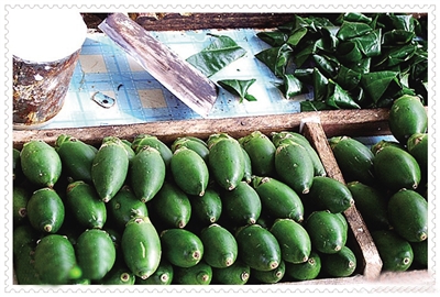 俗话说“一口槟榔一口灰”,在海南,蘸着石灰吃槟榔是一种独特的饮食时尚。海南人吃槟榔,喜欢嚼青果,将青嫩的槟榔果切成小块,然后再把槟榔的外皮和果蒂剥除,取青蒌的叶子涂上熟石灰叠成小三角状,称为“槟榔角”,一口塞进嘴里慢慢咀嚼,享受三种原料在口中释放出的刺激。渐渐地满口殷红,两颊泛红,如同喝了醇酒一般。苏东坡诗“两颊红潮增妩媚,谁知侬是醉槟榔”,便是描述了青春少女嚼槟榔之后娇态百出的情景。