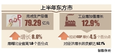 初步核算,上半年,东方市完成生产总值79.29亿元,增长8.6%,增幅比全省高1.0个百分点。据分析,东方市经济步伐的加快得益于工业。上半年,东方市工业增加值增长12.9%,对经济增长的贡献达52.1%,拉动GDP增长4.5个百分点,贡献率和拉动力均居国民经济各行业之首,继续挺起该市经济发展的脊梁。其中,去年入库的中海油东方石化有限责任公司和东方德森能源有限公司两家企业产能进一步释放,拉动GDP增长6.1个百分点。