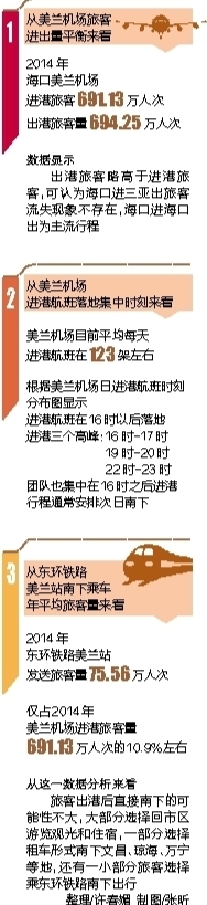 从三方面数据分析来看,散客和自由行中只有小部分乘坐高铁南下,大多数游客选择经美兰机场落地海口,而进港团队客源因受进港航班时刻及当地地接社计划影响,行程均安排海口过夜,次日启程南下。
