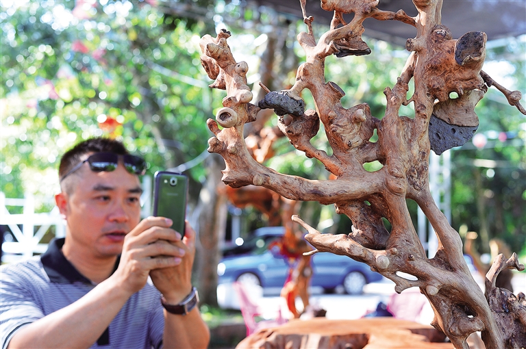 近日,海口市秀英区石山镇群众自制的根雕工艺品吸引了众多游客。根雕艺术品通过手机微信、QQ群等传播后,引来了更多商家采购。昔日当柴烧的荔枝根、菠罗格等树兜,现在变废为宝,全镇有上百户村民进行根雕制作,并设立了展览、加工基地,极大地提高了农民收入。本报记者 苏建强 摄