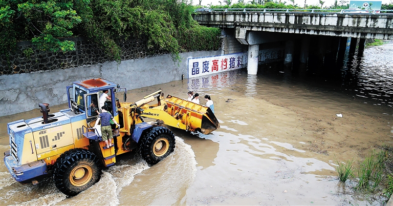 8月12日,位于海口市龙华区新坡镇的环岛高速路新坡出口处通道。积水很深导致车辆和行人通行困难,行人只好乘坐挖掘机通过。