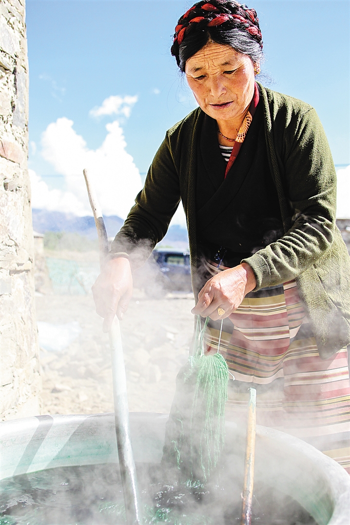 西藏山南地区贡嘎县杰德秀镇村民嘎日给编织“邦典”所用的羊毛线染色。 近年来,西藏山南地区贡嘎县杰德秀镇成立多个“邦典”编织农牧民合作社,带动980户、1400余人从事民族手工艺编织活动,实现年纯利润480万元,在保护国家级非物质文化遗产“邦典”的同时也增加了当地农牧民群众的收入。 新华社记者 陈益宸 摄