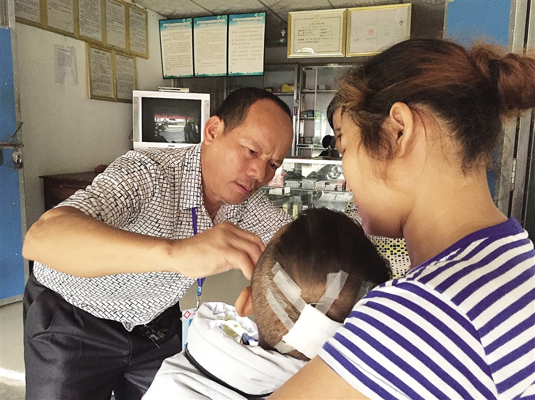 拐进村巷,田新村卫生室正有幼儿哭闹。“有点发烧,要吃药。”53岁的田新村卫生室医生陈文道盯着体温计,叮嘱家长。随后,他又仔细查看包扎着的孩子后脑勺,伤口愈合得不错,他才松了一口气。前几天,5岁的小文磕破了脑袋,鲜血直流,陈文道缝了两针,所幸并没有大碍。