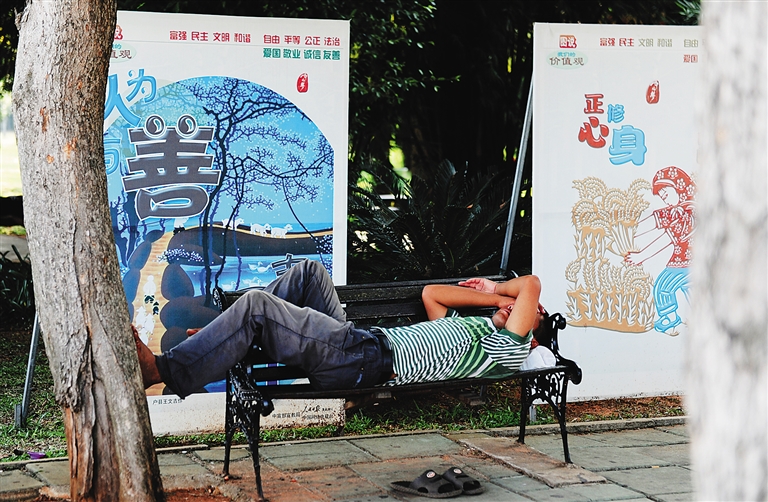 公园乱躺不雅 8月9日,海口市万绿园的长椅上,许多人光着膀子或光脚躺在上面,十分不雅。本报记者 苏建强 摄
