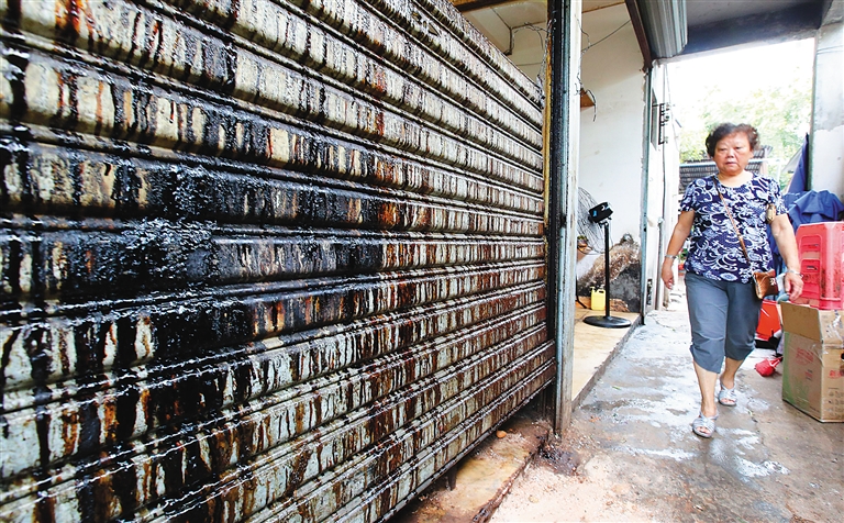 市场油污满墙 8月6日,海口市府城北胜农贸市场的墙立面上满是油污,肮脏不堪。 本报记者 张茂 摄