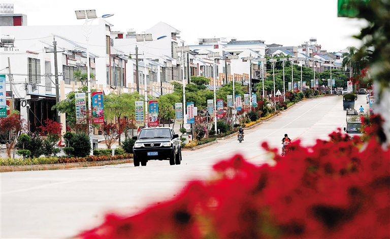 8月13日,在屯昌县枫木风情小镇,改造后的街道整洁漂亮,建筑风格协调统一,美观大方。枫木镇地处屯昌县西南部,是海南省重点建设的22个旅游风情小镇之一。从2012年屯昌县开始对枫木镇沿海榆中线两侧建筑进行立面改造,2015年春节前竣工。改造工程完工后,枫木镇成为美丽、生态、宜居小镇。目前枫木镇结合木色湖风景名胜区同时开发,带动该镇旅游业及相关产业发展,实现增收富民。