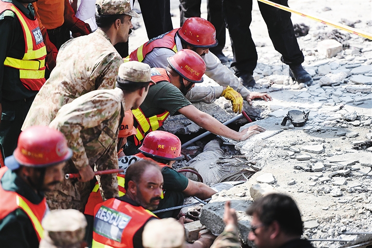 8月16日,在巴基斯坦阿塔克地区村庄沙迪汗,救援人员在爆炸现场搜救。当日,位于巴北部城市阿塔克的旁遮普省内政部会议室遭到自杀式爆炸袭击,造成包括旁遮普省内政部长舒贾·坎扎达在内的至少10人死亡、20人受伤。新华社/法新