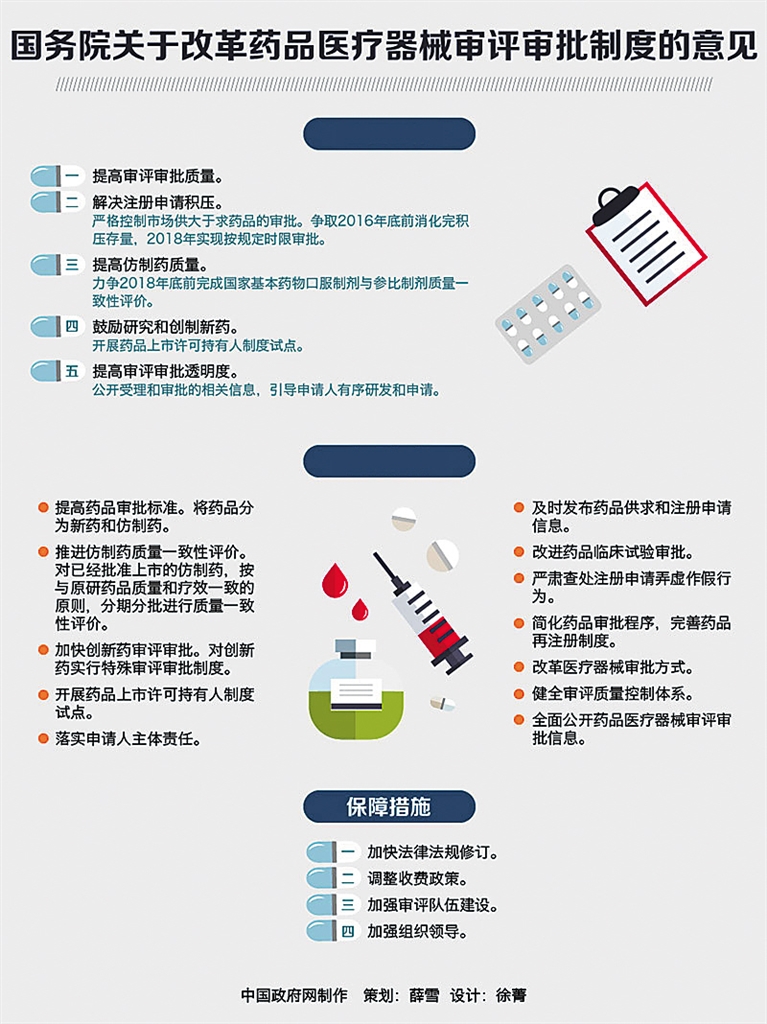 《意见》指出,近年来,我国医药产业快速发展,药品医疗器械质量和标准不断提高,较好地满足了公众用药需要。与此同时,药品医疗器械审评审批中存在的问题也日益突出,主要是药品注册申报积压严重,一些创新药品上市审批时间过长,部分仿制药质量与国际先进水平存在较大差距。出现上述问题,有着深刻的历史、体制和机制等方面的原因。