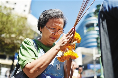 泰国曼谷市中心两天前发生爆炸的四面佛神庙19日上午重新对外开放,四面佛所在的拉差巴颂路口也恢复正常通车。