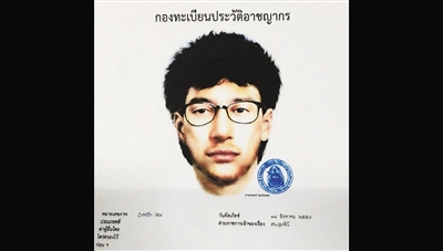 泰国警方按照爆炸现场一段监控录像,绘制出嫌疑人的素描头像。画像是一名年轻男子,肤色浅,发色深,轮廓立体,有淡淡的胡渣,戴一副黑框眼镜。