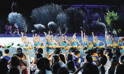 在舞蹈《七仙沐浴》节目中,身着红黄紫蓝等七彩纱裙的“仙女”或俯身舀水,或挽发梳洗,再现了“七仙”传说的美丽。“仙女”端着圣水走下舞台,把圣水纷纷泼向嘉宾、观众,嬉水民俗传统在这一刻充分展现,现场响起热烈的掌声。海口游客李中英说:“保亭嬉水节很有名,黎苗文化丰富,‘非遗’文化珍贵,都使我感到震撼。”