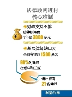 省司法厅相关负责人表示,海南全省有律师1500多名,人均律师拥有量在全国排名并不低,但由于受到地区经济发展水平和案源情况影响,接近90%的律师都集中在海口和三亚,律师资源分布存在不平衡问题,造成部分地区律师短缺,法律顾问的推进面临困难。