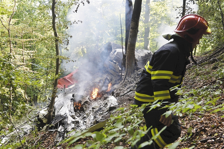 8月20日,在斯洛伐克西部的切尔韦尼·卡门村附近,消防员查看事故现场。 据斯洛伐克媒体报道,两架小型飞机20日在该国西部进行飞行训练时相撞,造成7人死亡。 新华社/路透