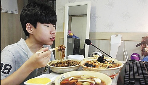 几乎每个晚上,韩国14岁少年金诚振(Kim Sung-jin)都会坐在电脑前,解决自己的晚饭。别以为他是贪玩儿,这个体形瘦削的男孩是在通过网络摄像头直播自己的进餐过程。 由于父母在外地工作,金诚振住在首尔南部的祖父母家,直播地点就是家中的一个小房间。金诚振从11岁起开始网络直播吃饭,起因是祖父母吃饭较早,他总是一个人吃晚饭,因此希望能有人陪着一起用餐。如今,金诚振是韩国网络直播Afreecar TV最年轻的吃货主播之一,昵称Patoo。Afreecar TV平均每月有800万访客,是韩国年轻人的重要社交渠道之一。 说起来,金诚振的晚餐也没什么特别的,通常是比萨饼、炸鸡或中餐,不过他在直播时会很好地跟网友聊天互动,在去卫生间的间隙还会给网友“留作业”。尽管金诚振的直播时间基本在晚上10点以后,还是有成千上万的网民会等在电脑前,看他吃饭。通过这档节目,金诚振成了小网红,他说,有时走在大街上,还有人认出他,向他打招呼。 据Afreecar TV介绍,大约有30万网络主播每个月都会在Afreecar TV上更新节目,同一时段Afreecar TV有大约5000个直播节目,金诚振提供的吃饭直播是最受欢迎、最容易盈利的一类。他最受网民欢迎的一期吃饭直播已经挣了大约1.1万元人民币。如今,网络主播已经成为韩国的新兴职业,顶级人气主播年收入过百万元人民币。