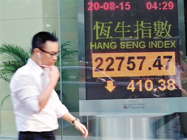 8月20日,一名行人从香港湾仔一家银行的恒生指数电子显示屏前走过。 当日,香港恒生指数下跌410.38点,收报22757.47点。 新华社记者 何靖嘉 摄