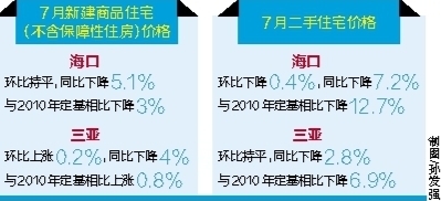 在国家统计局统计的70大中城市中,我省海口、三亚纳入统计。数据显示,7月份,我省这两座城市的房价走势整体稳健:海口新建住宅价格环比持平,同比下降5%;三亚新建住宅价格指数环比上涨0.2%,同比下降4%。海口新建商品住宅价格环比持平,同比下降5.1%;三亚新建商品住宅价格环比上涨0.2%,同比下降4%。二手住宅价格方面,海口环比下降0.4%,同比下降7.2%;三亚环比持平,同比下降2.8%。