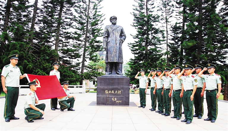 碧空如洗,松柏苍翠。坐落在文昌中学南面的张云逸将军纪念馆安静祥和,碧绿色琉璃瓦映照着阳光,高8米的将军铜像威严伫立,凝视着和平年代的新世界。