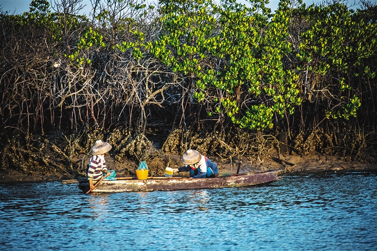 东寨港喇叭状出海口,西岸是海口市美兰区演丰镇仓头村,东岸是文昌市铺前镇。到了塔市渡口,唤几声“阿财”,船夫阿财很快出现面前,扶着客人跨到船上。