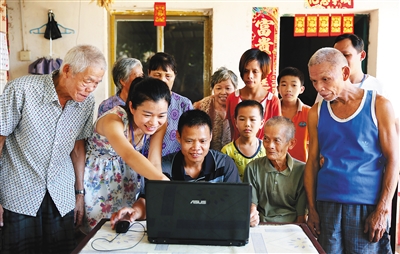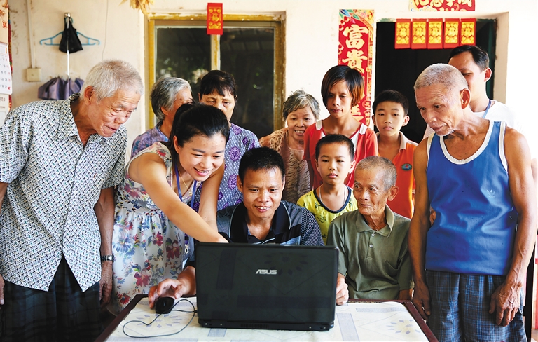 8月19日,儋州市和庆镇罗便村美迎村民小组,市互联网协会工作人员在教村民如何在互联网上做买卖。