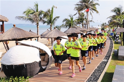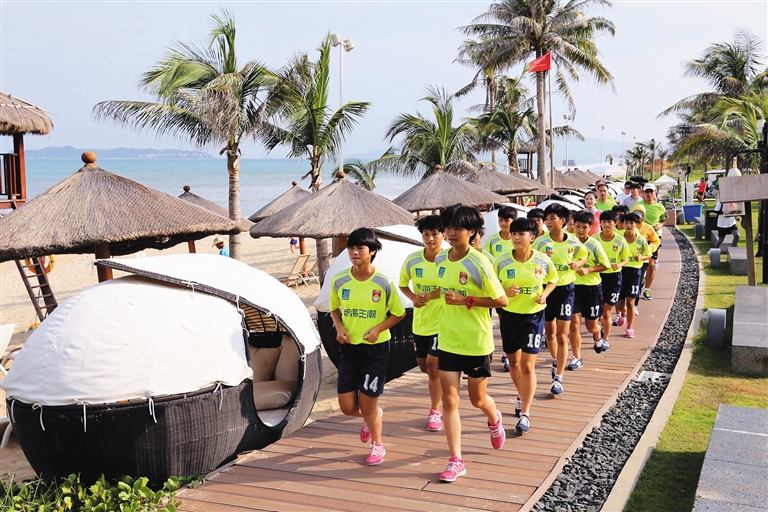 8月22日,14名琼中女足队员在三亚民生威斯汀度假酒店慢跑。