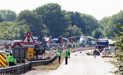 8月22日,在英国东南部西萨塞克斯郡,警方和救援人员在飞机坠毁事故现场待命。 据英国广播公司(BBC)报道,一架“霍克猎人”喷气式飞机当天13时20分左右在参加肖勒姆航展时坠向地面,与数辆汽车相撞,目前已确认有7人死亡。 新华社/法新