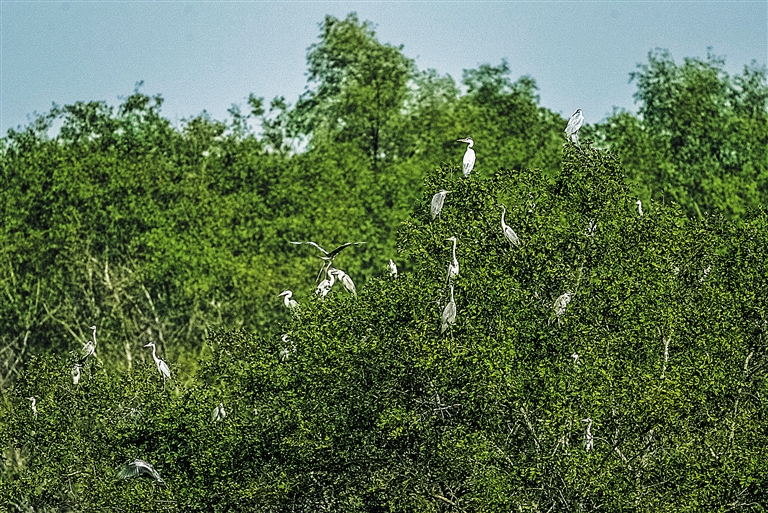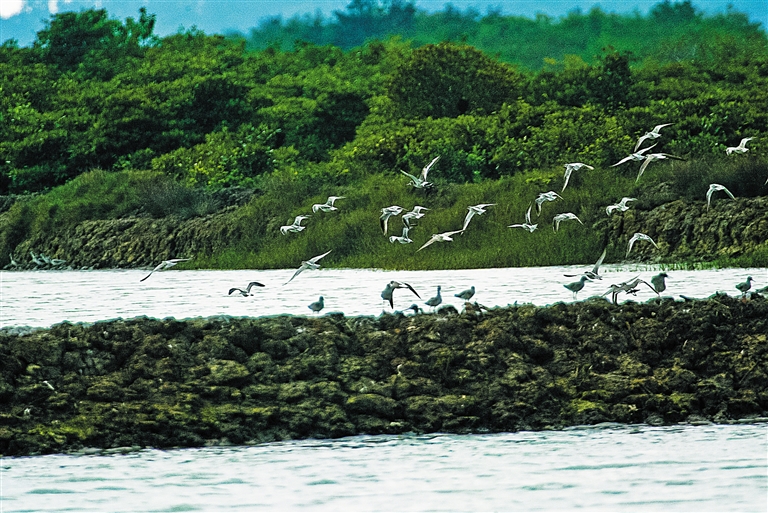 如果说红树林是大自然设计在海上的森林天堂,那么这些精灵们则给这座天堂带来了生机与活力。记者站在高处,远远看去,见到成群结队的雁在红树林中腾空飞起,翱翔蓝天;见到白鹭在滩涂上懒懒地四散着相互间梳理羽毛、啄来啄去嬉戏;还能听见山斑鸠歌唱着“kroo kroo-kroo kroo”;还有体型强壮的游隼在鼓翼飞翔时穿插着滑翔,那是他在空中巡猎……