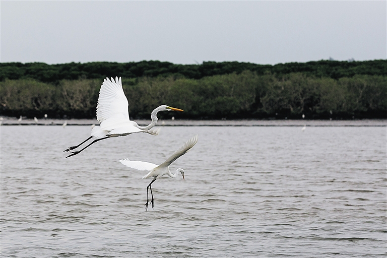 黑脸琵鹭对环境十分敏感,世界野生动物保护基金会将之列为生态环境的指示性物种。东寨港红树林生活着黑脸琵鹭,就表明这里的生态环境好,湿地质量高。