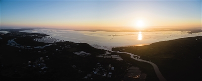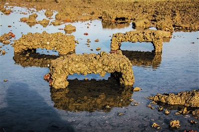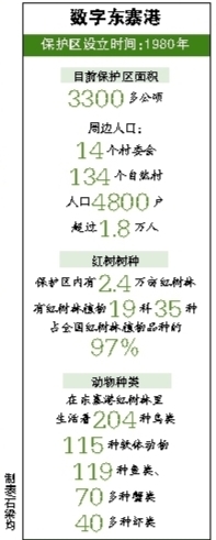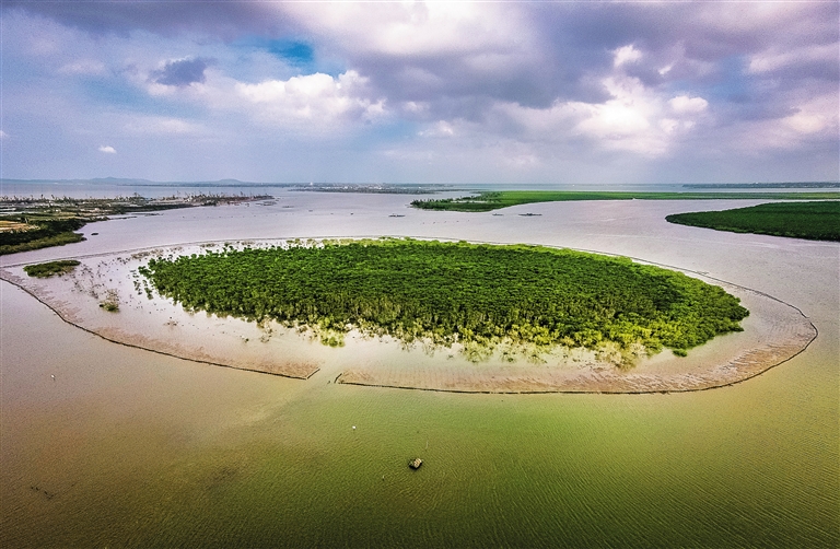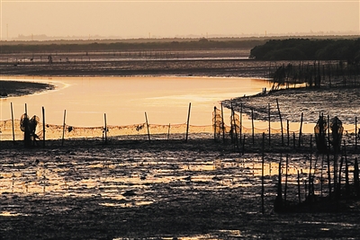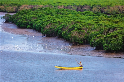 小潮时,大海涌至此而为两岸绿廊逼仄,成了溪道。若是逢了满潮,海天一色,蓝的海天之间浮动百里绿荫,蓝绿辉映,美得眩目。
